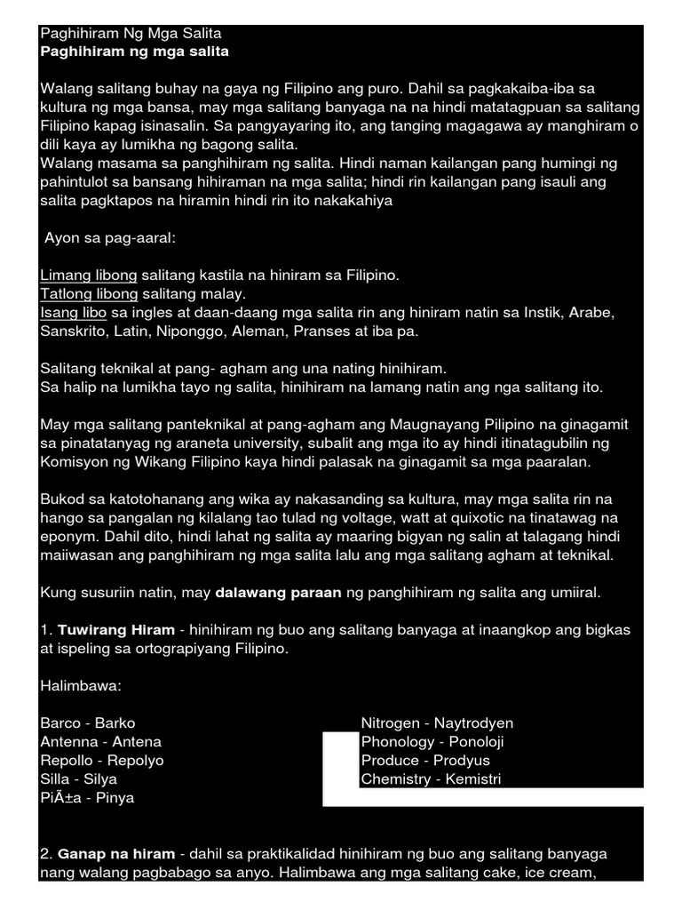 Ang hiram na salita ay salita sa ibang wika na sa katagalan ay binibigyan ng baybay Filipino. 50 Mga Halimbawa ng Sawikain at Kahulugan Sa video na ito ay matututunan mo kung ano ang sawikain mga halimbawa ng sawikain at kung paano ito gamitin sa isang pangungusap. Isinama sa wikang Filipino ang mga Kastilang salitang hiram bilang resulta ng 333 taon.
